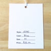 Printable hang tags ready to print on 8.5 x 11 inch card stock. These are suitable for retail or wholesale sales where you need an easy and inexpensive hang tag. You can print as many or as few as needed. You will receive two versions of each tag, one pre-printed with spaces for your style details and price. The second is blank. You can apply a stamp or sticker to the reverse side of the hang tag. The tags are arranged on the page to minimize waste. The hole-punch hole is small enough the hole will disappear when punched.