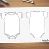 A vector line drawing of a baby infant bodysuit. This bodysuit has lapped shoulders, short sleeves, binding, and a snap closure at the bottom. The drawing has proper proportions and stitching lines, perfect for use in a tech pack or product mock-up. Front and back views are included. This is a digital download sent as a ZIP archive and includes the following high resolution files:
